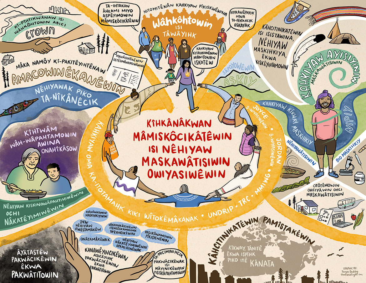 - Asici ôma owiyasiwêwin êkwa ôhi mâmiskotamâkêwina ta-ki-mâmitonêyihcikâtêk êkwa kaskihtâwin ka-osihcikêhk êkwa ka-âhkami osihcikêhk miyw-âyâwin pîtos isi pîhci ôma askiy. Kiapacihtânaw êka ê-pônihcikâtêk kiskinawâpahtahiwêwin êkwa wâh-wâpahcikêwin êwako êka Nêhiyaw nîkânêwin, ôma kiskinawâpahtahiwêwin êwako ka-âpacihtayahk kiki miskwêyihtamowin êkwa namôy êkosi isi ta-âpatan. Ê-nitawêyihtamahk ta-mâmitonêyihcikâtêk ta-mêskwacipayik ka-isi mêkiyahk miyw-âyâwin kanawêyihtâkosiwin pîhci ôma askiy êkosi isi kîhkânâkohtanaw sôhkisiwina pîhci mâmawâyâwinihk êkwa pêyakoskânihk.