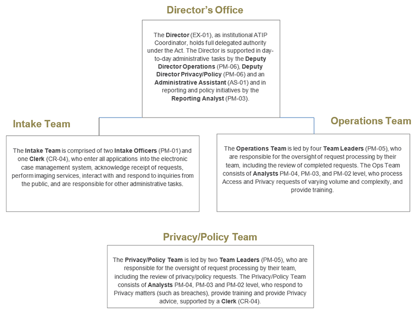 The Director (EX-01), as institutional ATIP Coordinator, holds full delegated authority under the Act. The Director is supported in day-to-day administrative tasks by the Deputy Director Operations (PM-06), Deputy Director Privacy/Policy (PM-06) and an Administrative Assistant (AS-01) and in reporting and policy initiatives by the Reporting Analyst (PM-03).
