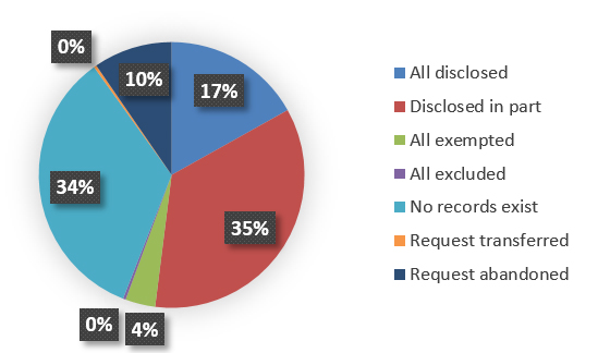 Of the 302 requests closed during the reporting period, ISC was able to fully or partially disclose records in 157 cases; that is, 52% of the time a request was submitted to ISC, the result was a disclosure of records. Overall, 160 (53%) of the 302 requests were closed within the statutory 30 day timeframe.