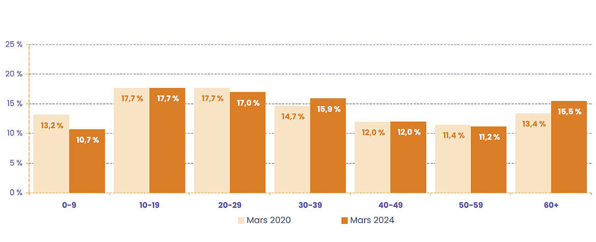Population de clients admissibles par groupe d’âge, genre et région : Mars 2024