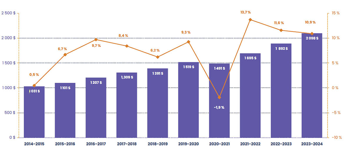 Au cours des dix dernières années, le nombre total de clients admissibles selon le SVS est passé de 824 033 en mars 2014 à 959 207 en mars 2024, ce qui représente une augmentation de 16,4 %.