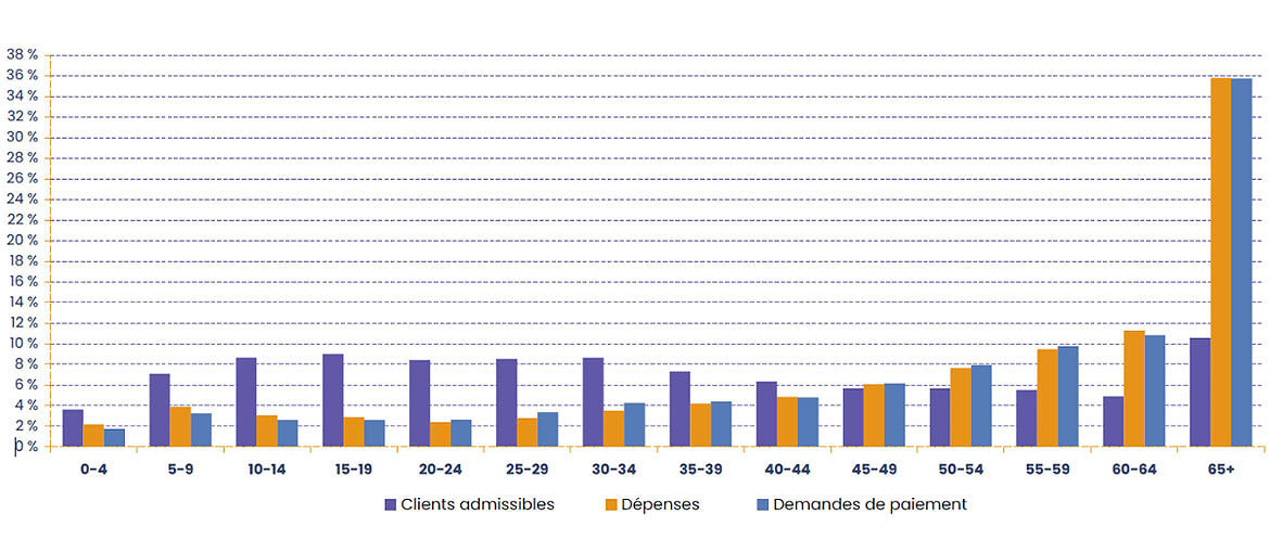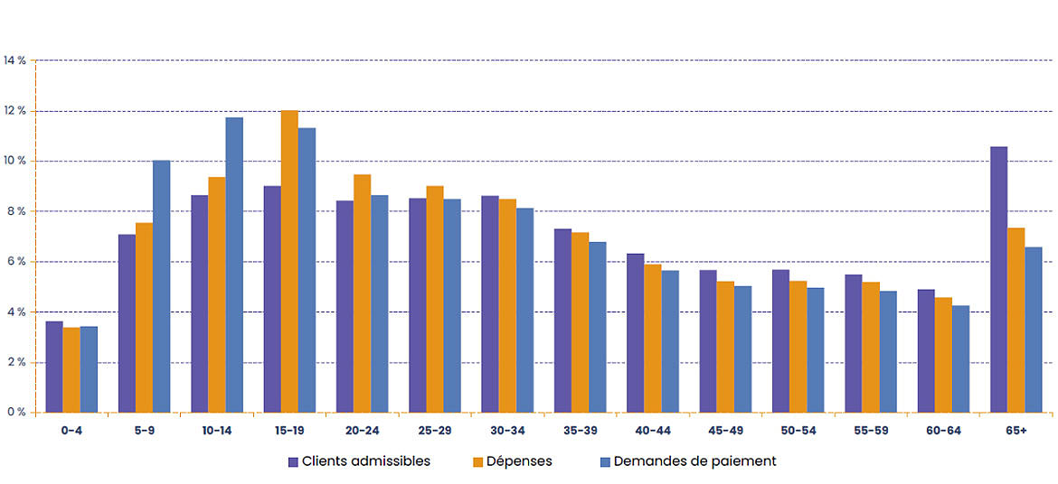 Afin de répondre aux défis liés à la production de rapports liés au petit nombre de clients du programme SSNA choisissant une désignation de genre non binaire à l'heure actuelle et dans le respect des obligations ministérielles en matière de confidentialité, les données sur la population et l'utilisation relatives aux personnes de la catégorie « Autre genre » ont été réparties dans les deux autres catégories de genre et sont indiquées par le symbole « + ».
