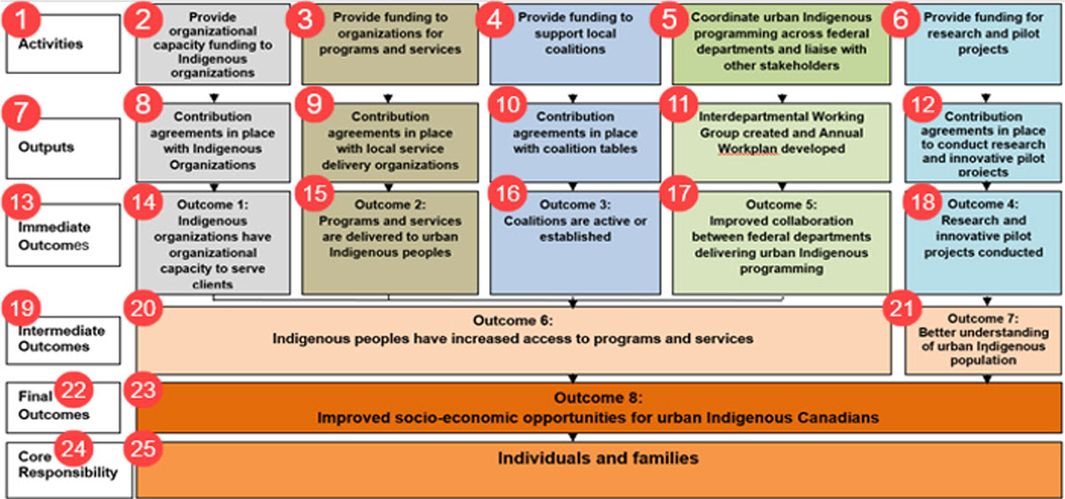 - Travailler avec les partenaires autochtones vivant en milieu urbain pour redéfinir le modèle logique de programme des PUPA et les indicateurs de rendement.